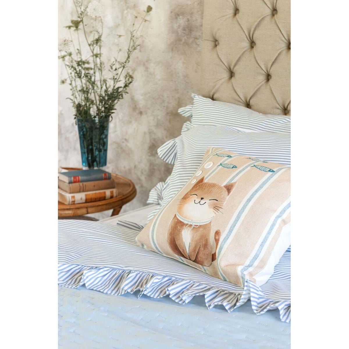 Meraviglioso cuscino in cotone a righe beige e azzurre con ricercata stampa di un simpatico gattino e pesciolini e arrichito di bottoni applicati. Per un tocco elegante e raffinato, ma allo stesso tempo festoso questo cuscino, realizzato con materiali di qualità, è la soluzione ideale per dare un tocco di classe alla tua casa.