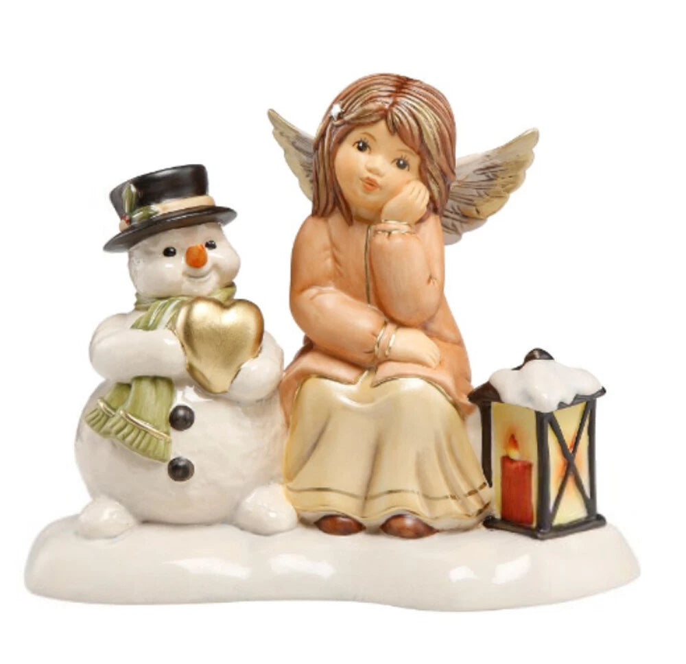 Accanto a un divertente pupazzo di neve con cilindro e cuore d'oro, siede un adorabile angelo con una stellina Swarowski tra i capelli e avvolta in un cappotto color terracotta accanto a una lanterna. Chissà cosa sta aspettando?