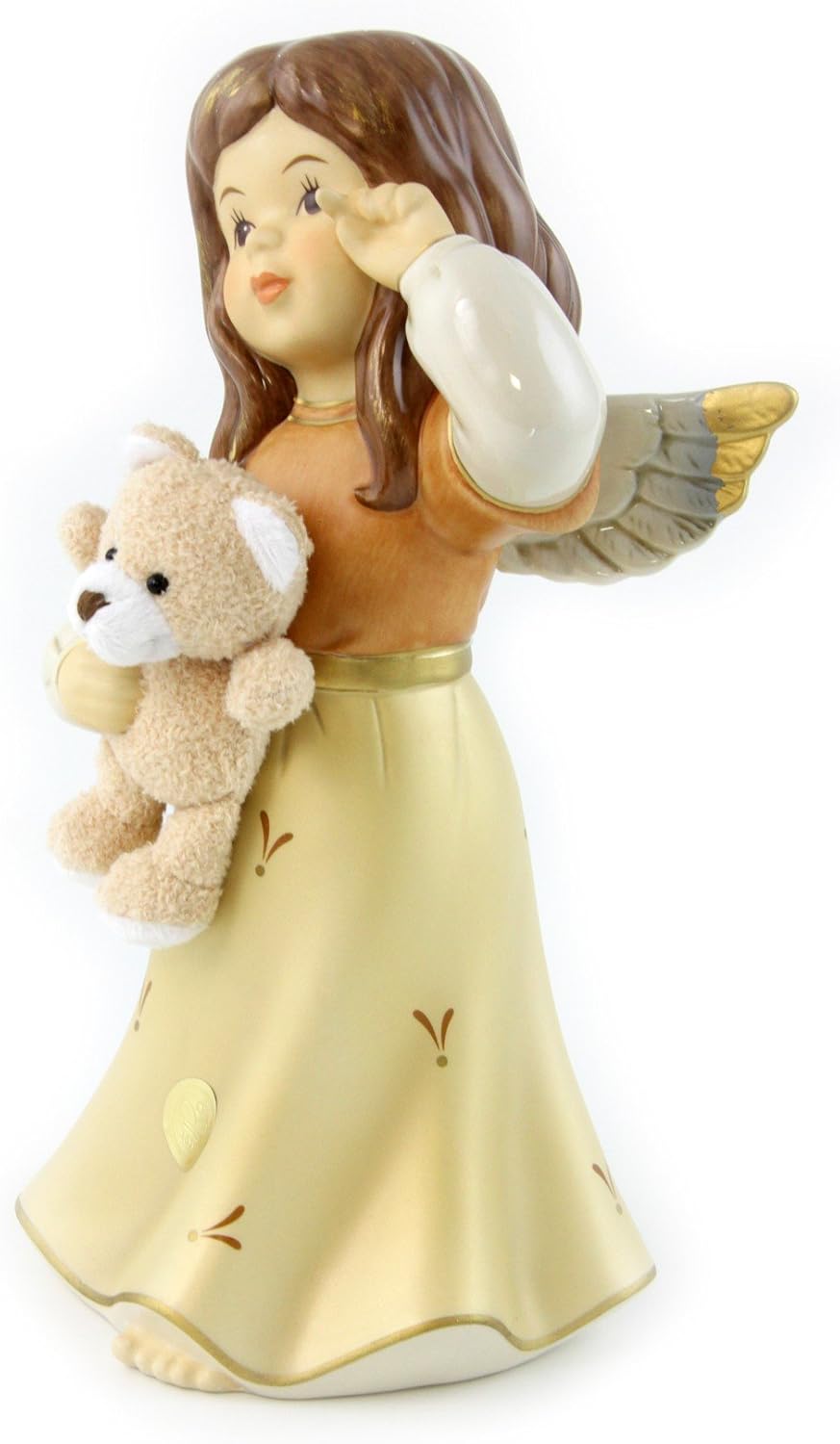 Un orsetto di peluche tra le braccia di questo dolce angelo in porcellana di Goebel.