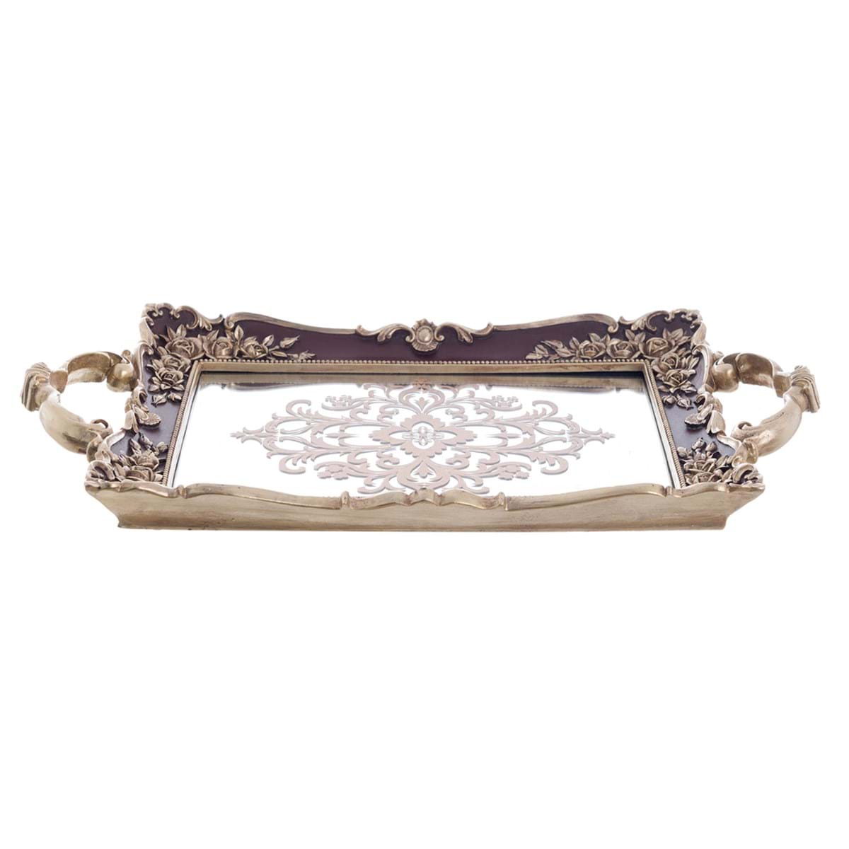 Vassoio a specchio decorato della collezione Villa Clara, in stile barocco, color vinaccia bordeaux con eleganti decorazioni dorate a rilievo. Un accessorio di charme che aggiunge un tocco di opulenza e raffinatezza a qualsiasi ambiente.